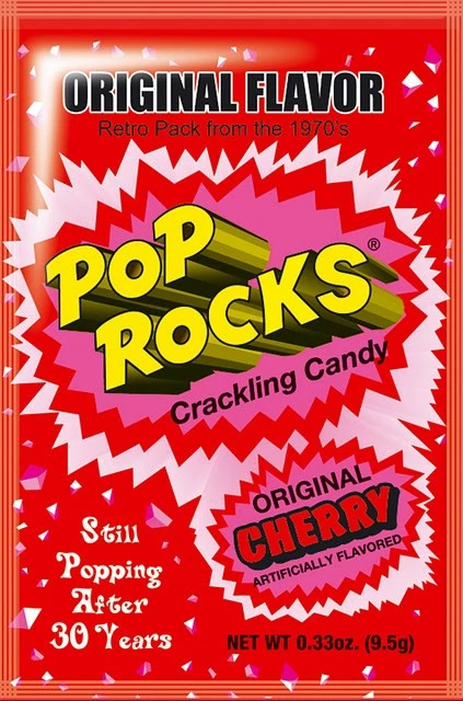Pop Rocks is a carbonated candy made mostly of sugar, corn sugar, lactose, and flavoring. The candy is rock candy. The popping ingredient is carbon dioxide, which is packed into the candy under extreme pressure.Once in the mouth, it is exposed to the moisture of saliva, causing it to fizzle and "POP!"